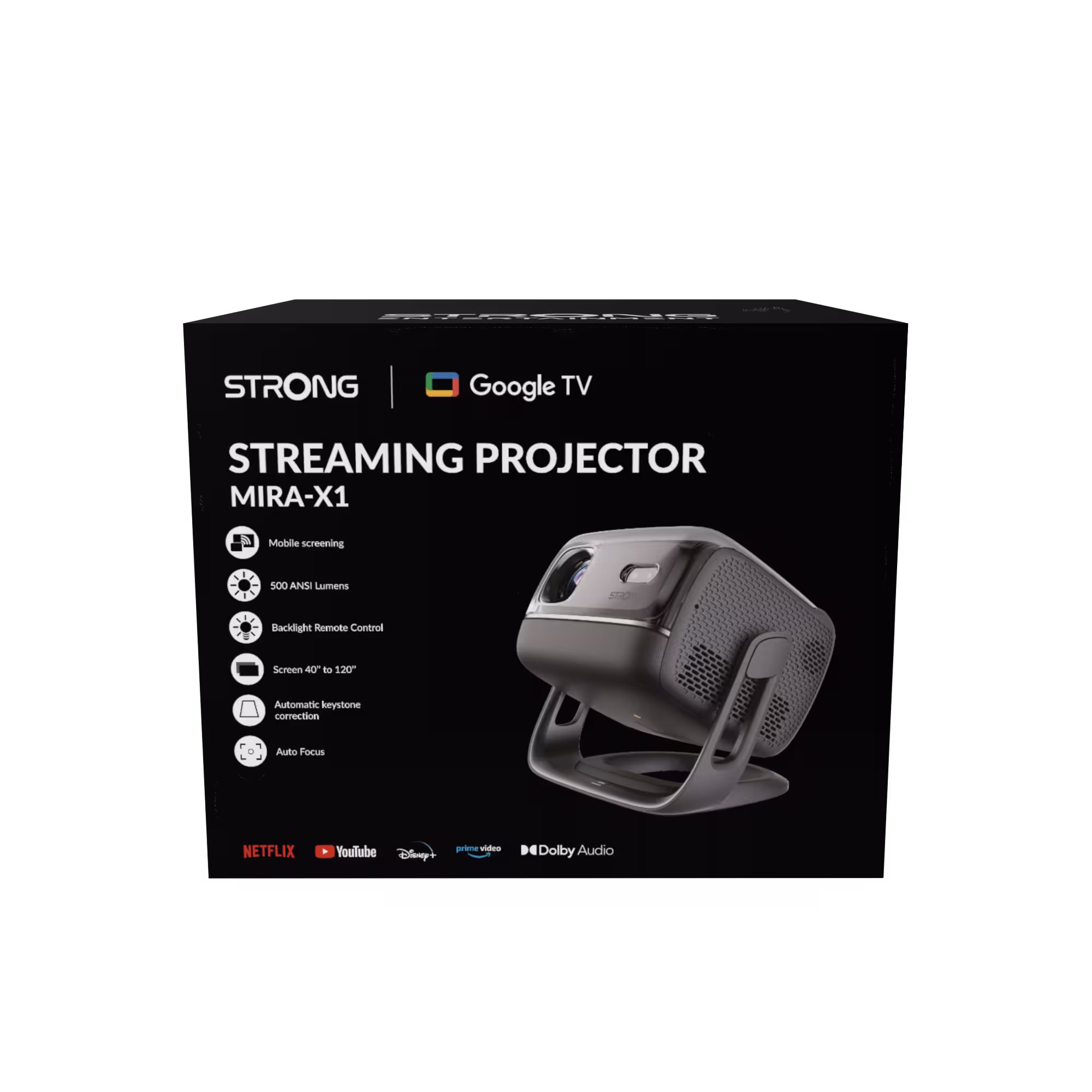 Meet MIRA-X1, a sleek and modern video projector designed to elevate any room with its refined black finish. With an impressive 500 ANSI Lumens, it delivers bright, sharp images up to 120 inches, perfect for movies, series, gaming, or presentations. Powered by Google TV, the MIRA-X1 offers seamless access to all your favourite streaming platforms. Its advanced convenience features, including auto focus, auto frame correction, and obstacle avoidance ensure effortless setup and a perfectly adjusted picture every time. Combined with stereo sound, dual-band Wi-Fi and Bluetooth 5.0, the MIRA-X1 blends performance and simplicity. Thanks to its built-in stand, it is both portable and versatile, allowing you to project your content wherever you need with optimal stability.